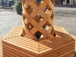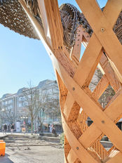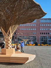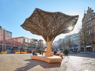 Der schattenspendende komorebi kombiniert eine zweistufige Sitzgelegenheit mit einem lichtfilternden Flachsfaserdach. Dank der FORMIC-Transporteinheiten des auf Schwerlasttransportsysteme spezialisierten Startup FORMIC Transportsysteme GmbH des KIT kann er flexibel auf dem Platz bewegt werden und bietet dadurch unbegrenzte Möglichkeiten, den Kronenplatz zu gestalten. Die Jungfernfahrt erfolgte im Dezember 2024.